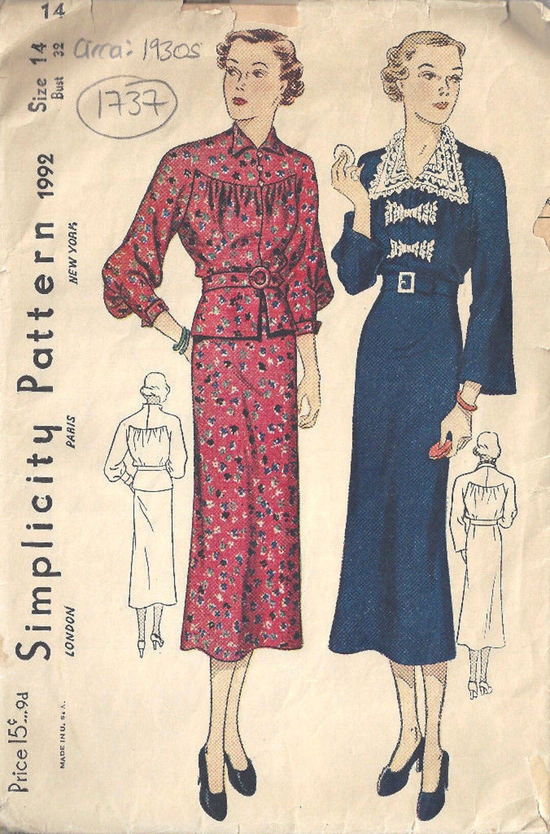 1930s Vintage Sewing Pattern B32 Dress 1737 Simplicity Etsy